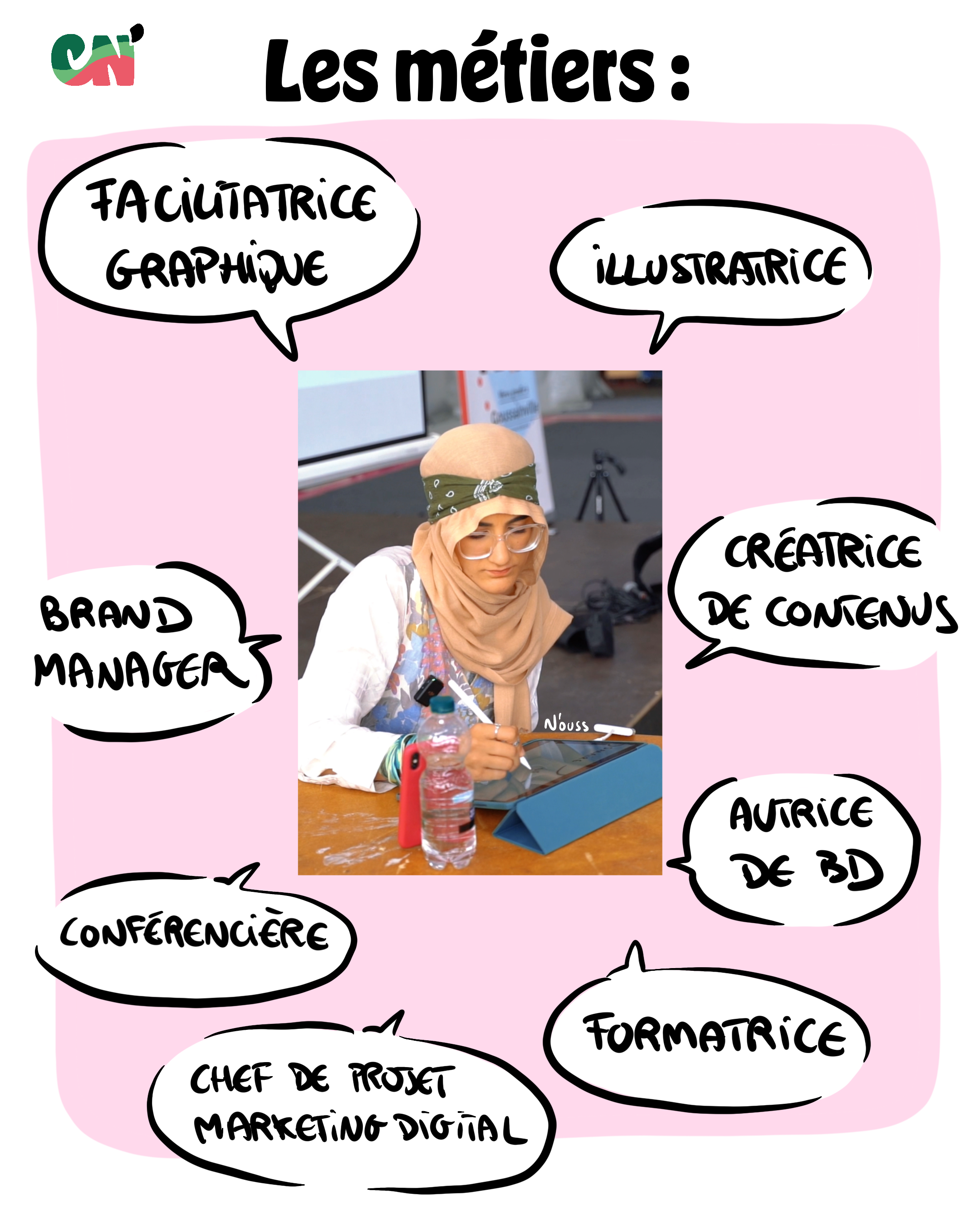 Mon prénom en arabe il peut se traduire par “qui facilite”, et c’est un peu mon mantra au quotidien : simplifier le complexe, rendre accessible ce qui paraît lointain, mettre en images ce que les mots peinent parfois à exprimer. Il m’a fallu du temps pour identifier ce super-pouvoir qu’est la facilitation graphique. Je suis passée par plusieurs étapes : des études en linguistique, puis en communication digitale, avant de vivre ce fameux déclic : celui où j’ai compris que je pouvais réunir la communication, l’illustration et la stratégie dans une seule et même passion.