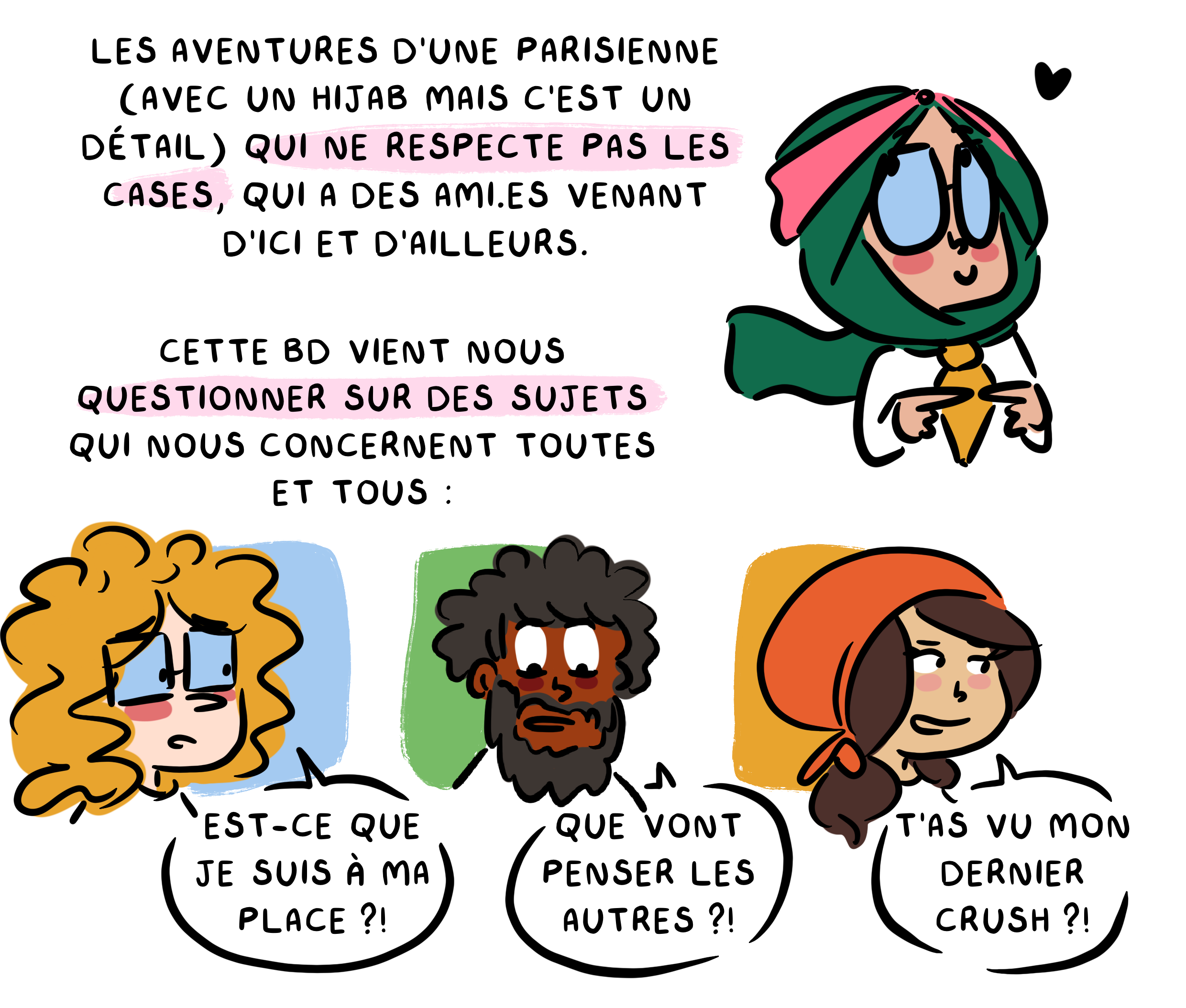 Cette bande dessinée parle de mon parcours, de mon identité, de mes doutes, de mes galères, de mes victoires, de mes contradictions. Bref, de la vie, la vraie, celle qui pique parfois, mais qui fait du bien à raconter. Cette vie c’est celle d’une femme, arabe, musulmane, portant le hijab et le tout en France. Ouais je sais, ce n'est pas le starter pack d’une vie facile.